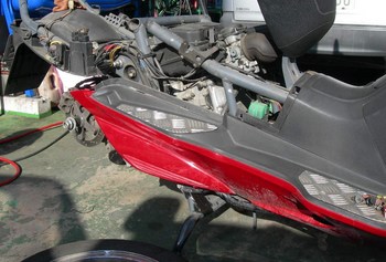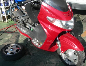 スカイウェーブ! 2009年2月14日一般整備アオキ電装 本業ではありませんが、お客様に頼まれて時々バイクの修理もやります。 できませんとは言えないですよ~! (もちろん2輪の認証工場の申請も取ってありますよ~) こういったスクータータイプは、まずカウルを外さないとなんにもできないんですね。 やり慣れていないので少し戸惑ってしまいました。 今回はタイヤ交換・リヤブレーキパッド交換・エンジン不調修理を やらせて頂きました。ご入庫ありがとうございました!