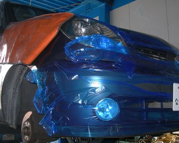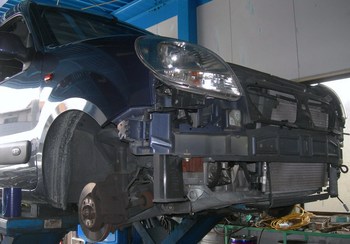 バンパー等に傷がつかないように保護テープを貼って作業を開始します。