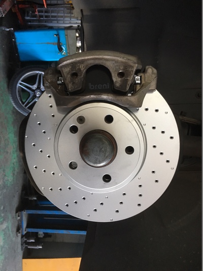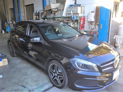 ベンツ A160 W176 ブレーキ整備! 2018年10月31日車の電気修理日記, 一般整備アオキ電装 純正で、ドリルドローターなんですね 最近ご要望の多い低ダストのブレーキパッドに 交換致しました。